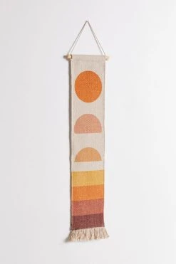 Bring a sunny glow to your wall of art with this wool tapestry, cut long with evolved phases of a sunset in a linear orientation. Topped with a wooden dowel and twine for hanging.