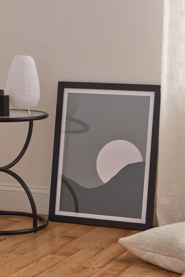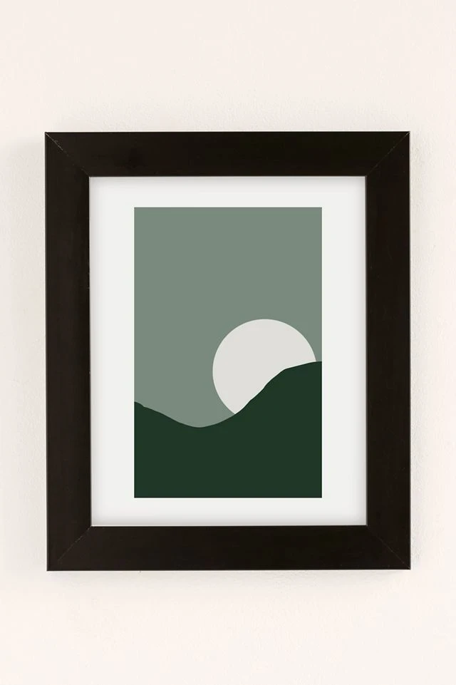 Minimalist graphic art print by Aleeya Jones, capturing a sun beaming from behind the horizon line. Printed on archival paper made from cotton pressed in Italian mills, this high-quality art print is available in sizes and frames just right for your space. First select your frame (or go frameless), then select your size.