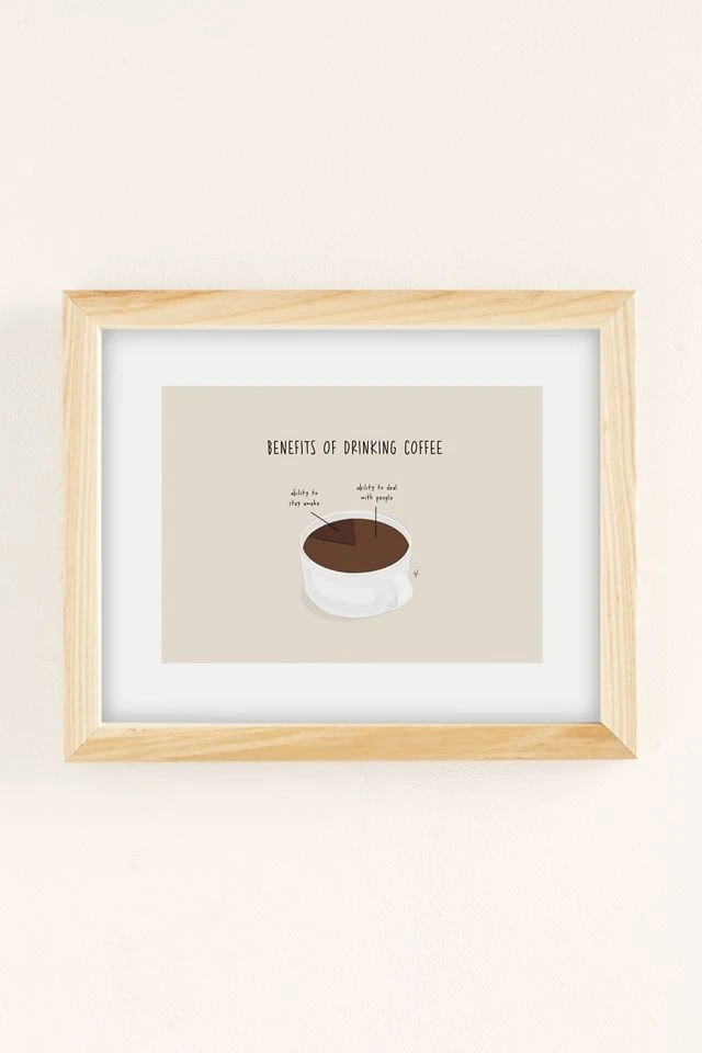Enjoy that extra cup of coffee you’ve been longing for with this art print by Amy Franke featuring an illustrated graphic of the benefits of coffee. Printed on archival paper made from cotton pressed in Italian mills, this high-quality art print is available in sizes and frames just right for your space. First select your frame (or go frameless), then select your size.