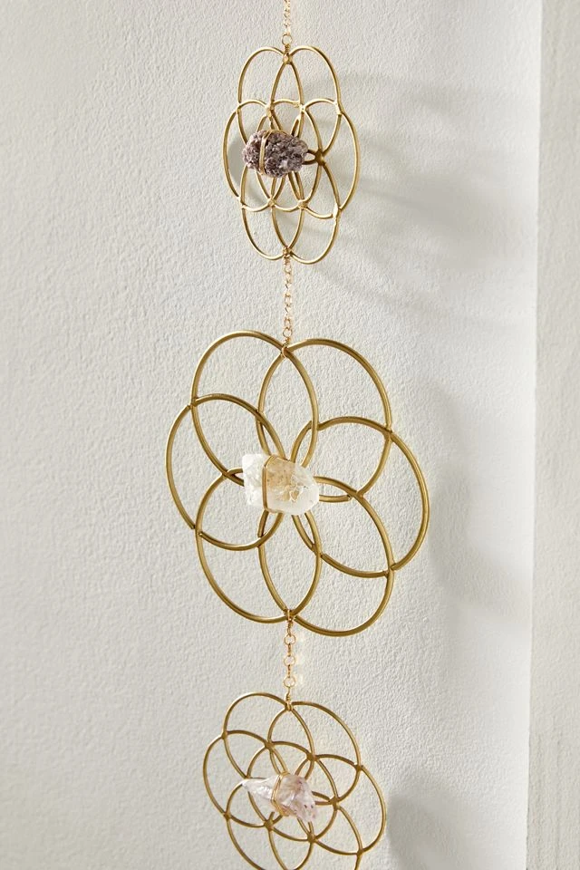 Bring mystical light to your space with this brass wall hanging by Ariana Ost. Featuring linear flower pendants accented with crystals and strung along a twinkling chain link.