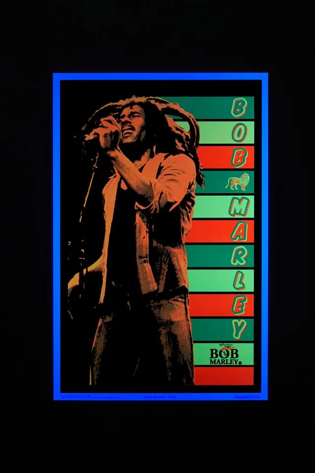Bring loving vibes to your space with this blacklight poster featuring Bob Marley.