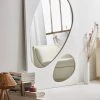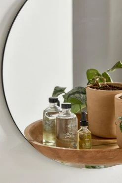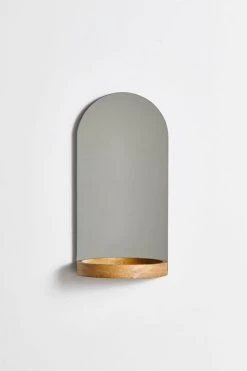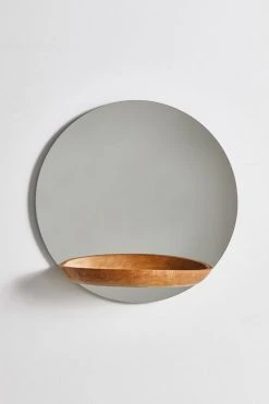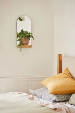 Modern-boho wall mirror with a built-in wooden shelf for creating a striking display of your favorite trinkets and treasures. Rimless mirror offers a fresh look while the curve-edged shelf creates an inviting aesthetic. Available exclusivley at Urban Outfitters.