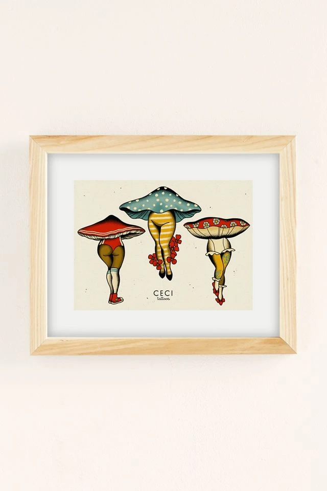 Va-va-voom shrooms with vintage-inspired styling lend a whimsically kitschy accent to your space with this art print by CeciTattoos. Printed on archival paper made from cotton pressed in Italian mills, this high-quality art print is available in sizes and frames just right for your space. First select your frame (or go frameless), then select your size.