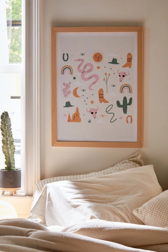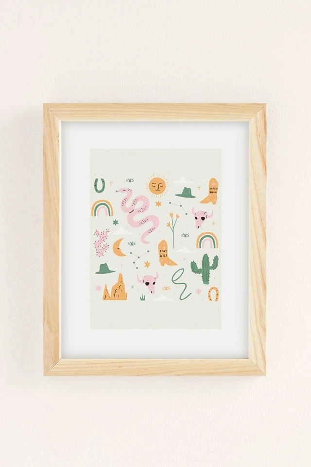 Wild West vibes with a touch of whimsy, this art print by Charly Clements features desert-inspired icons rendered with a playful look we love. Printed on archival paper made from cotton pressed in Italian mills, this high-quality art print is available in sizes and frames just right for your space. First select your frame (or go frameless), then select your size.