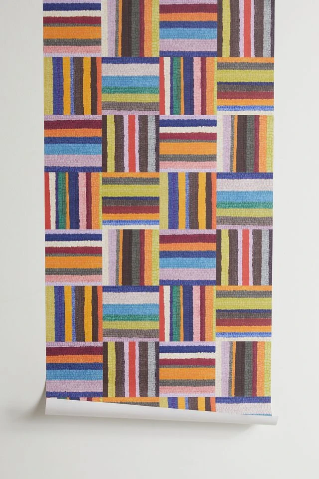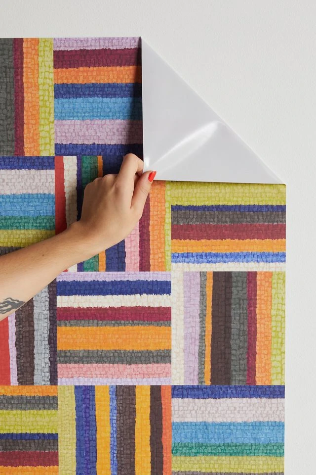Easily removable stick-on wallpaper featuring a multi-colored striped square motif. Cut in panels you can use to accent one wall or tile all over your room, in a matte finish with vibrant, water-based, non-toxic inks. Comes with one strip of wallpaper in an allover repeating pattern – choose from three different sizes to best suit your space. Available exclusively at Urban Outfitters.