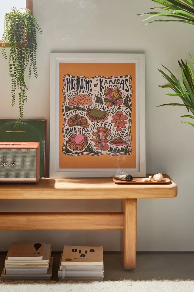 A visual catalog of mushrooms native to Kansas, this art print from Doodle By Meg captures a retro-cool aesthetic inspired ‘60s design and a foraging ethos. Printed on archival paper made from cotton pressed in Italian mills, this high-quality art print is available in sizes and frames just right for your space. First select your frame (or go frameless), then select your size.