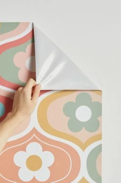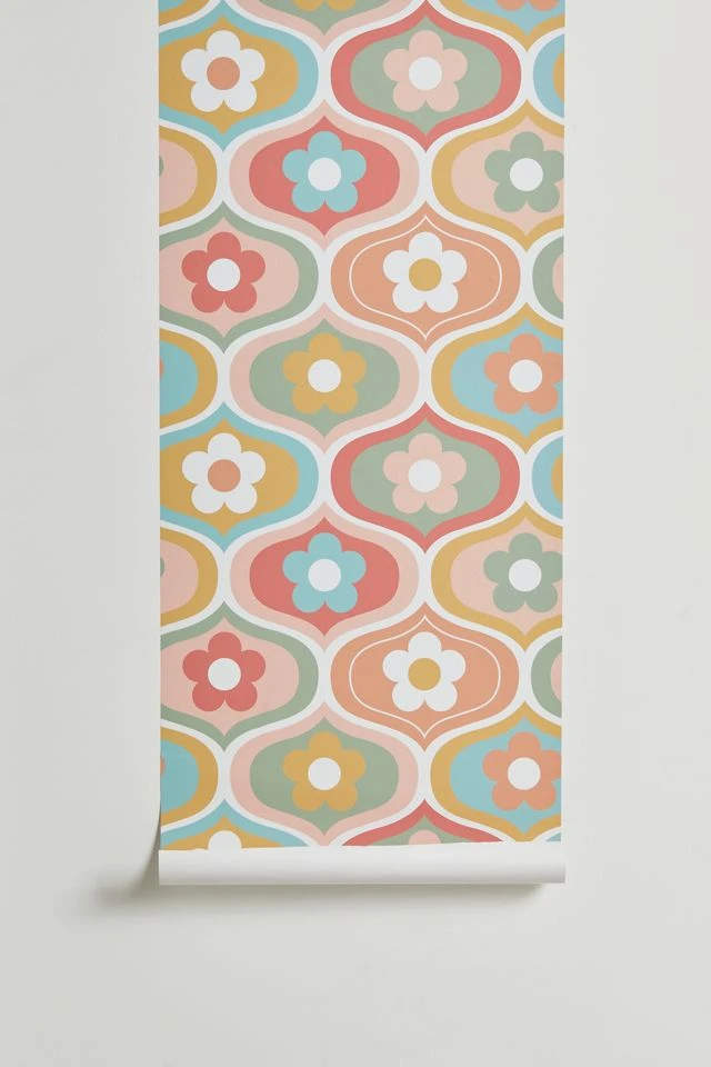Easily removable stick-on wallpaper featuring a retro-inspired geometric floral motif by Emanuela Carratoni. Cut in panels you can use to accent one wall or tile all over your room, in a matte finish with vibrant, water-based, non-toxic inks. Comes with one strip of wallpaper in an allover repeating pattern – choose from three different sizes to best suit your space.