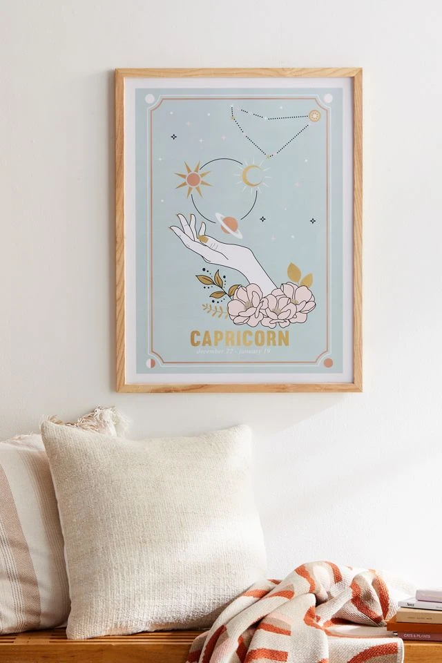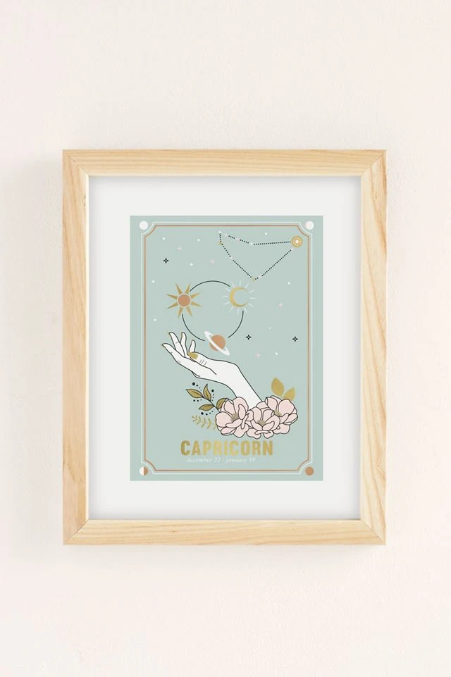 Get it with this Capricorn art print by Emanuela Carratoni, that serves as a reminder to channel that inner drive, featuring astrology-themed iconography all over. Printed on archival paper made from cotton pressed in Italian mills, this high-quality art print is available in sizes and frames just right for your space. First select your frame (or go frameless), then select your size.