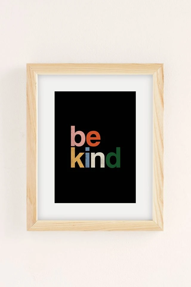 Art print from Eveline featuring a note to be kind in multi-colored lettering. Printed on archival paper made from cotton pressed in Italian mills, this high-quality art print is available in sizes and frames just right for your space. First select your frame (or go frameless), then select your size.