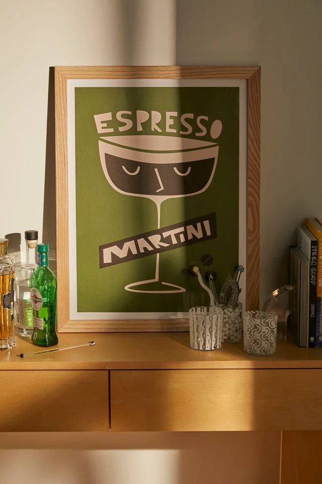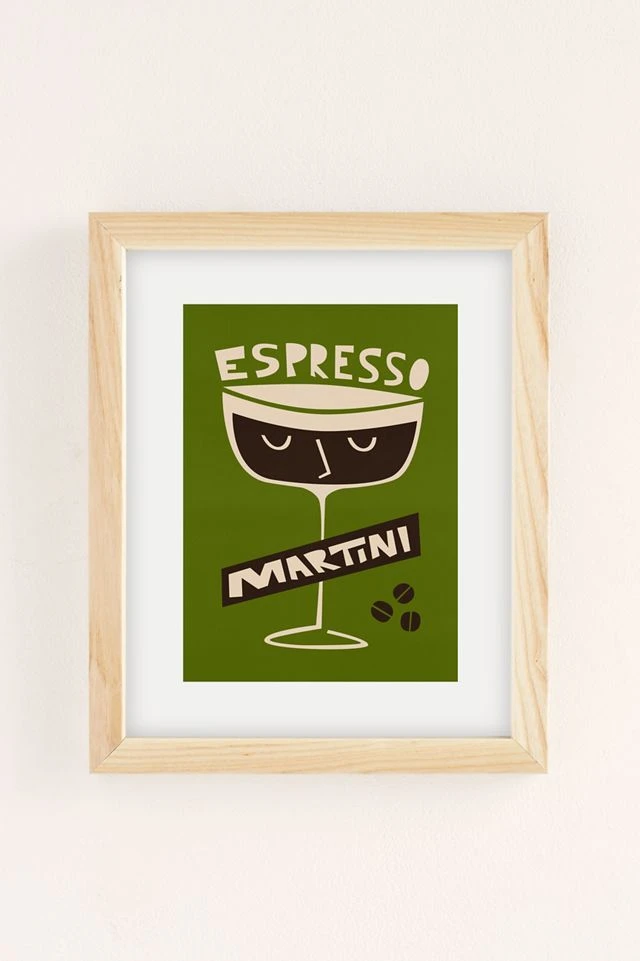 Art print by Fox And Velvet featuring a playful illustration of an espresso martini. Printed on archival paper made from cotton pressed in Italian mills, this high-quality art print is available in sizes and frames just right for your space. First select your frame (or go frameless), then select your size.