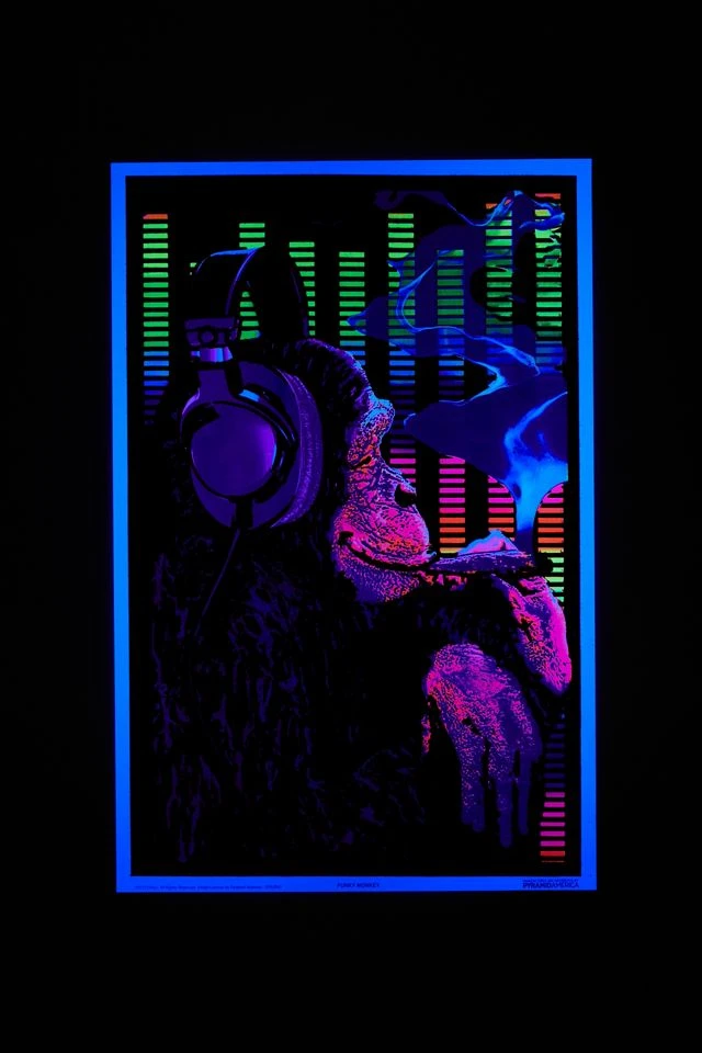 Bring psychedelic vibes to your space with this blacklight poster featuring a relaxing monkey.