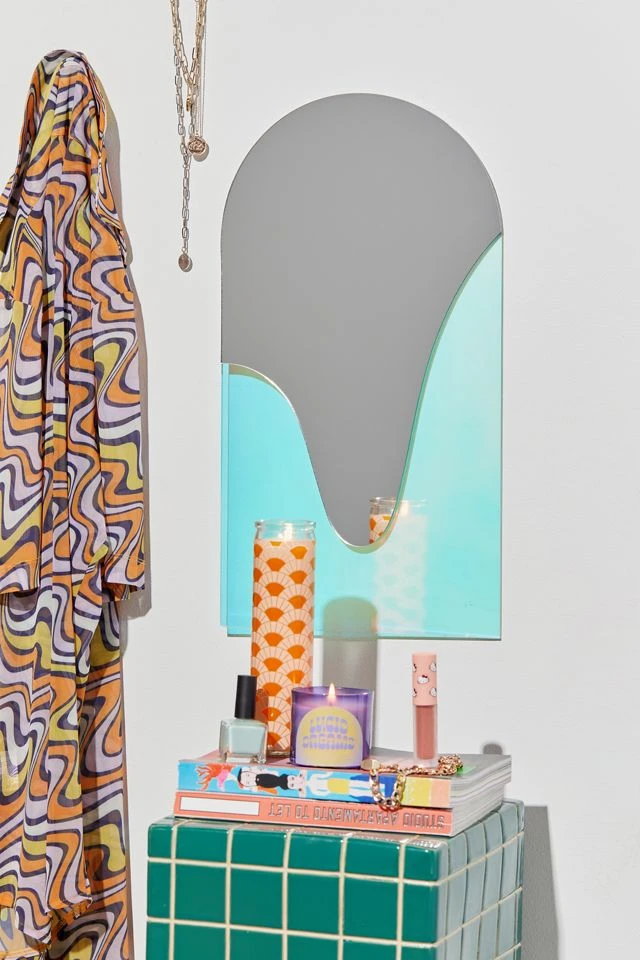 Create an eye-catching display in your space with this mirror from Galisfly featuring an arch silhouette formed by layers of colorful acrylic. Topped with a puddle-shaped mirror that adds an artful feel to your getting-ready space. Crafted in the USA by Galisfly, this mirror may show some distortion from a distance. Mounts to wall with hardware attached at back.