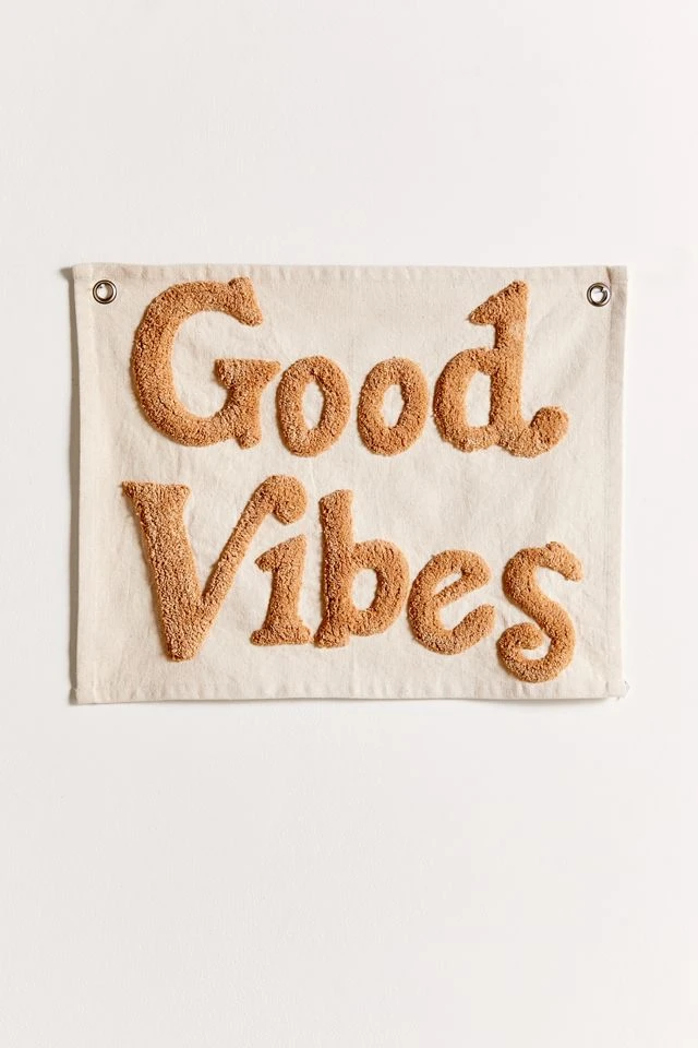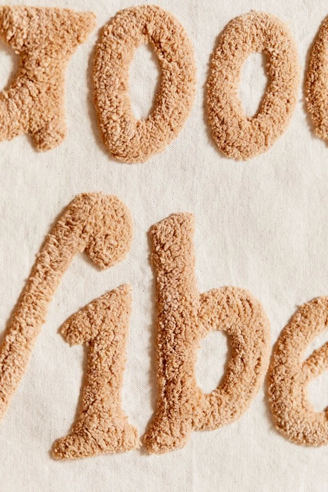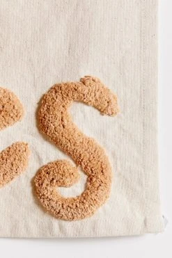 Easy-going tapestry, made from a cotton weave with raised, tufted detailing across the text.