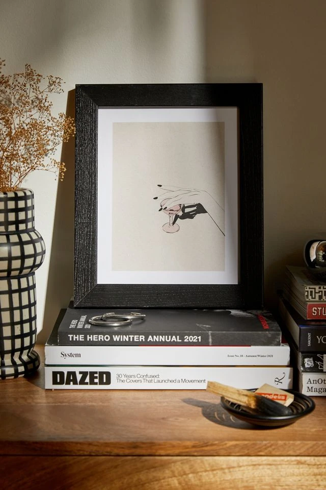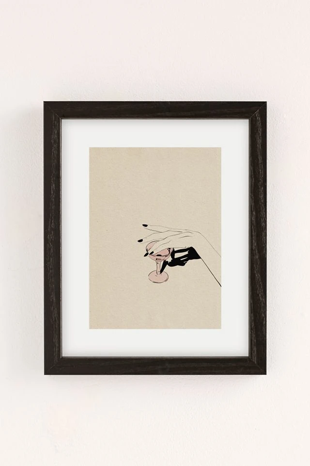 Vintage-inspired art print from High Tied Creative featuring a rose-colored coupe glass. Printed on archival paper made from cotton pressed in Italian mills, this high-quality art print is available in sizes and frames just right for your space. First select your frame (or go frameless), then select your size.