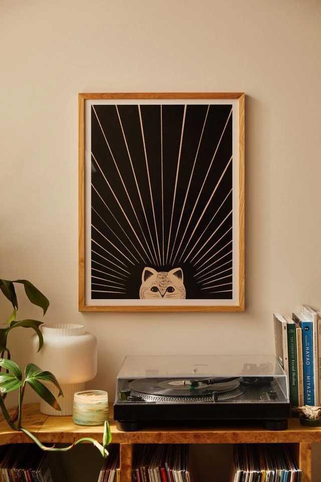 Art print by Jimmy Tan featuring a little kitten rising like the sun. Printed on archival paper made from cotton pressed in Italian mills, this high-quality art print is available in sizes and frames just right for your space. First select your frame (or go frameless), then select your size.