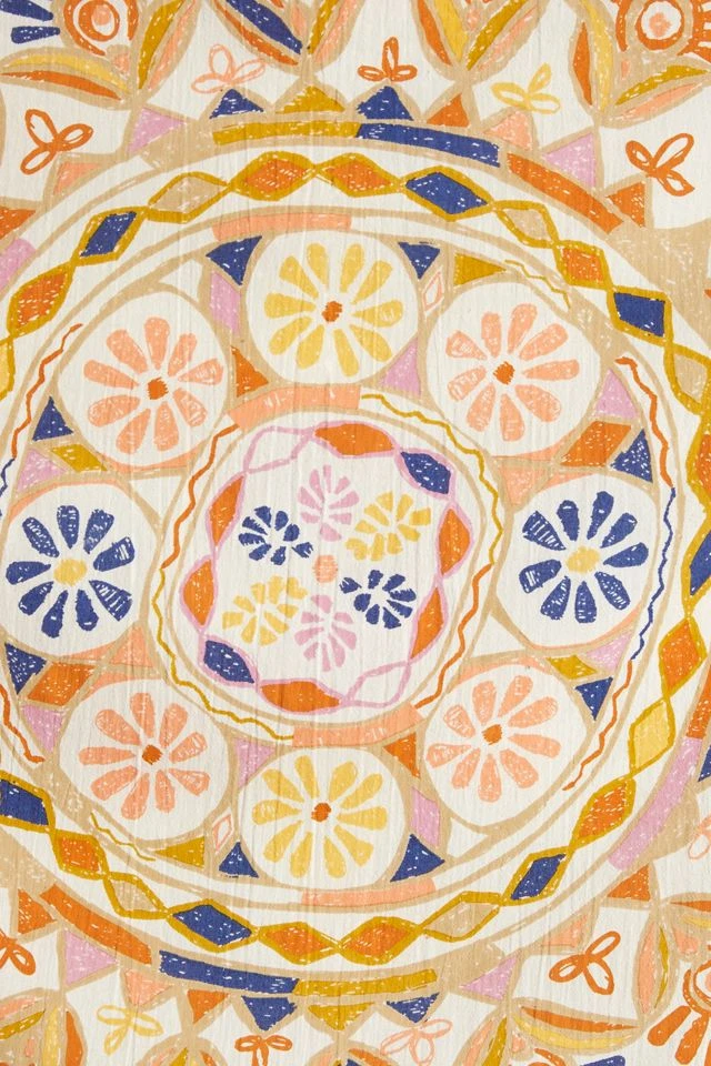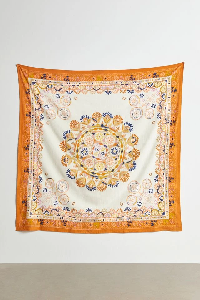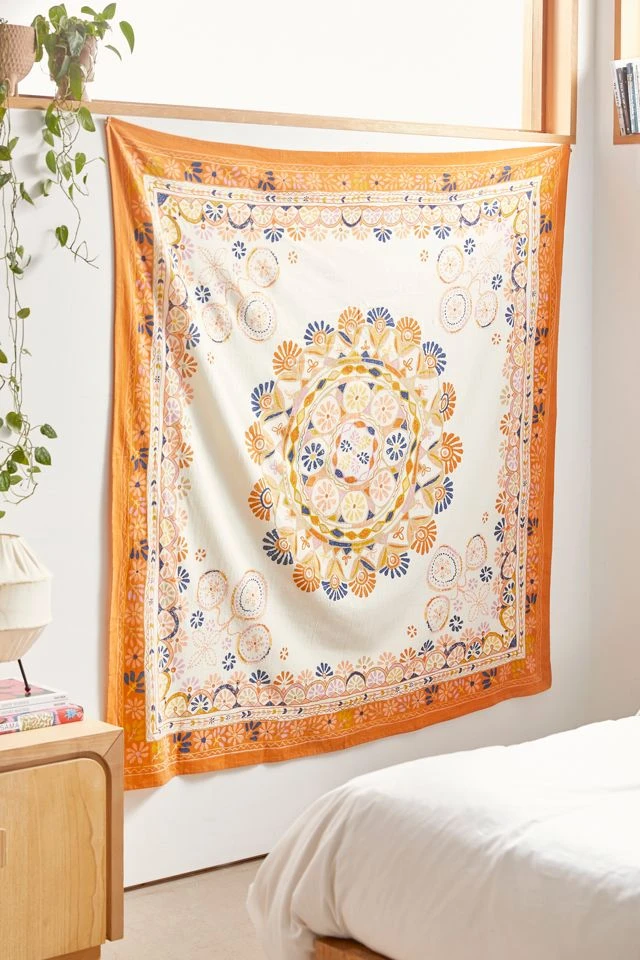 Brighten your space with this large tapestry featuring a mandala design comprised of floral and geometric motifs in vibrant hues.