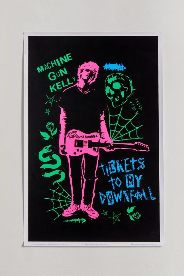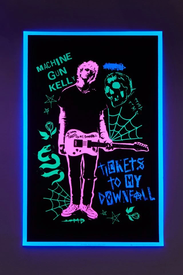 Make your space glow with this blacklight poster featuring art inspired by Machine Gun Kelly’s album, _Tickets To My Downfall_, rendered in fluorescent inks with black flocking.