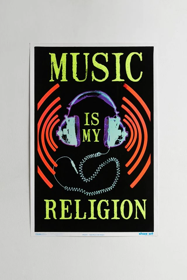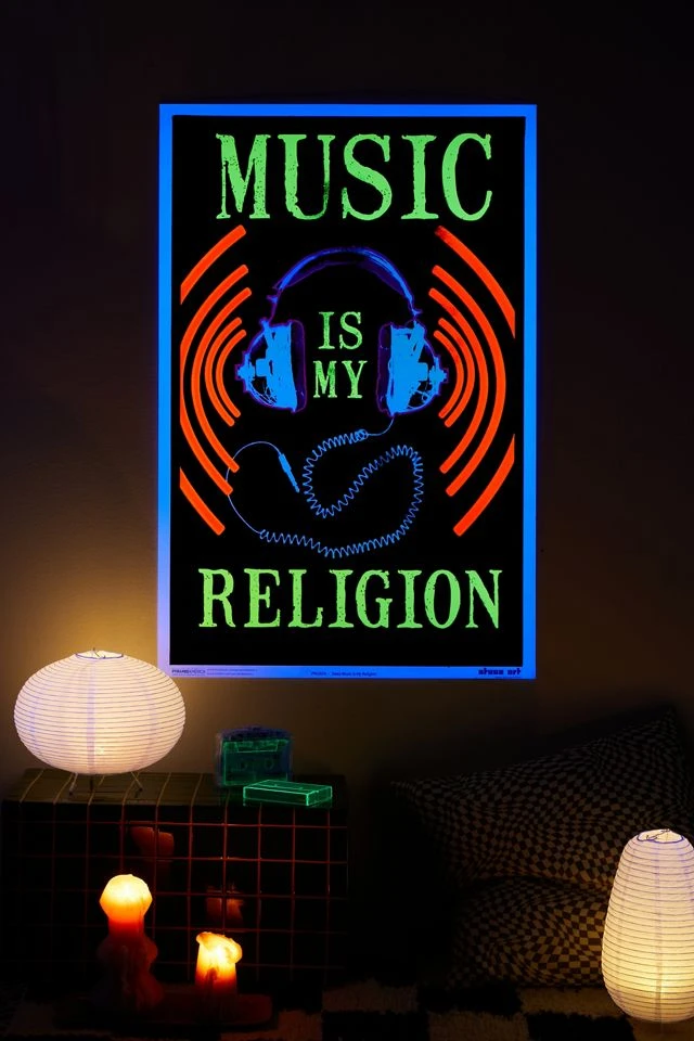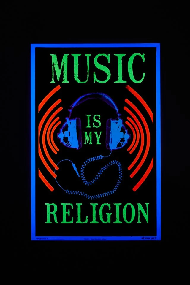 Blacklight poster featuring a fluorescent pair of headphones that add a pop of color to your space.