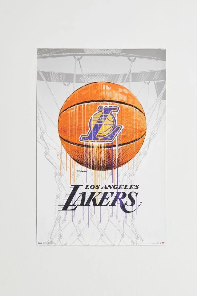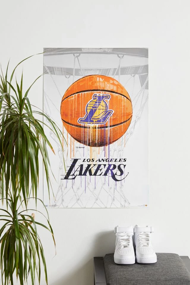 Celebrate your favorite sports team with this poster featuring a basketball splattered with the Los Angeles Lakers’ logo.