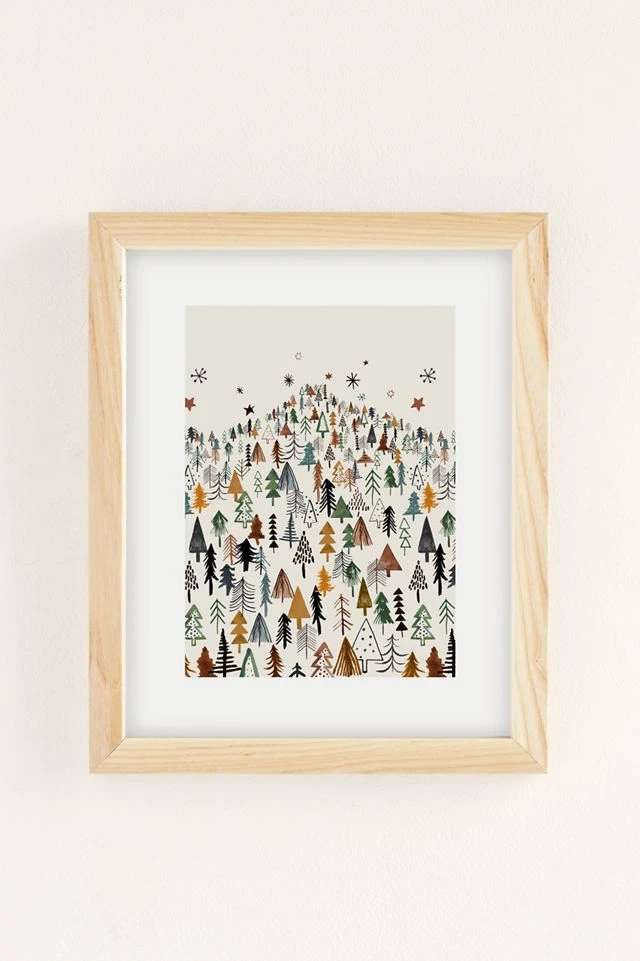 Whimsical art print by Ninola Design that captures a collection of trees in a variety of hues that create a charming forest landscape. Printed on archival paper made from cotton pressed in Italian mills, this high-quality art print is available in sizes and frames just right for your space. First select your frame (or go frameless), then select your size.