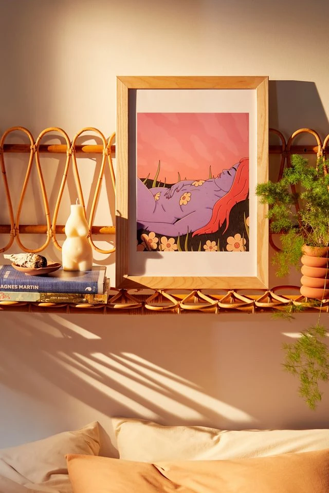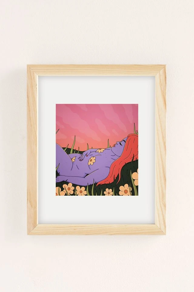 Art print by Robin Eisenberg featuring a figure snoozing in a field of flowers. Printed on archival paper made from cotton pressed in Italian mills, this high-quality art print is available in sizes and frames just right for your space. First select your frame (or go frameless), then select your size.