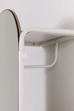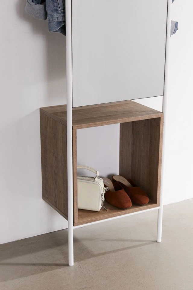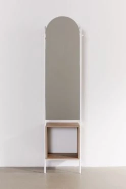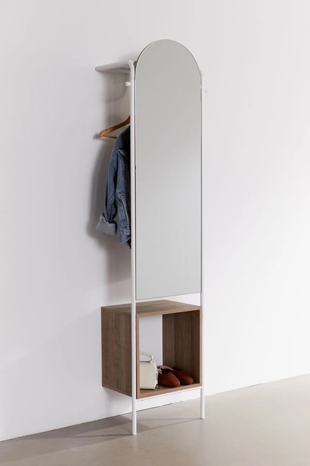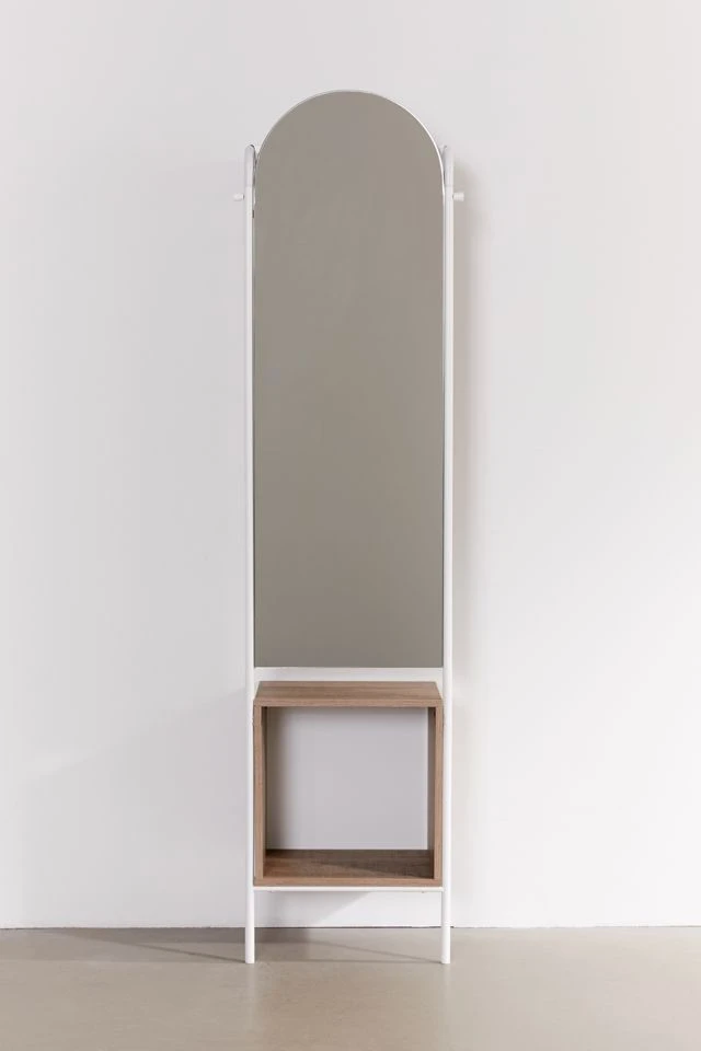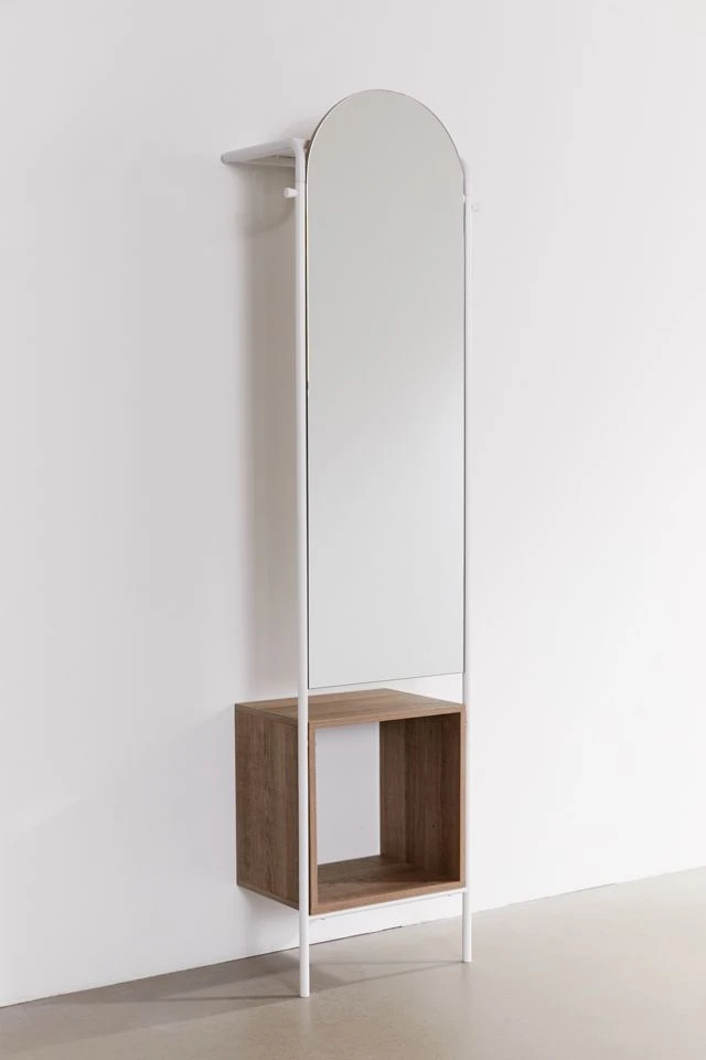 Leaning storage mirror, perfect for catching a last look before you head out for the day. Featuring an arched mirror with metal framing and cube storage cubby at base for shoes and more. With hooks along the side for hanging scarves, jackets, bags and more! Assembly hardware included.
