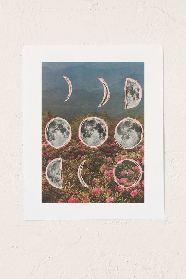 Channel the phases of the moon with this cosmic art print featuring a collaged design by Sarah Eisenlohr that pairs lunar motifs with a dreamy floral landscape. Printed on archival paper made from cotton pressed in Italian mills, this high-quality art print is available in sizes and frames just right for your space. First select your frame (or go frameless), then select your size.