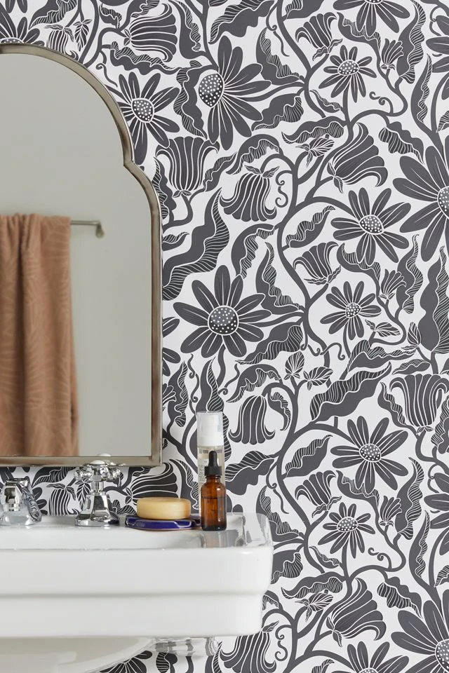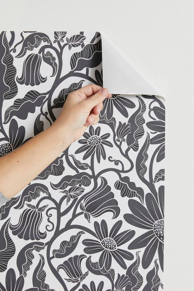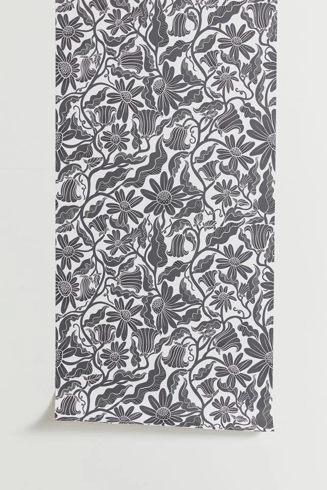 Easily removable stick-on wallpaper by Sewzinski featuring a monochrome floral motif. Cut in panels you can use to accent one wall or tile all over your room. Comes with one strip of wallpaper in an allover repeating pattern – choose from three different sizes to best suit your space.