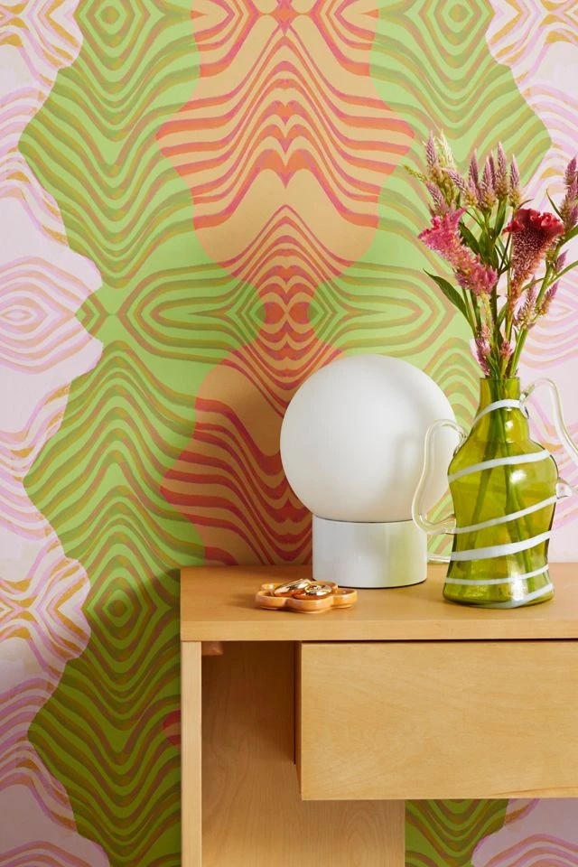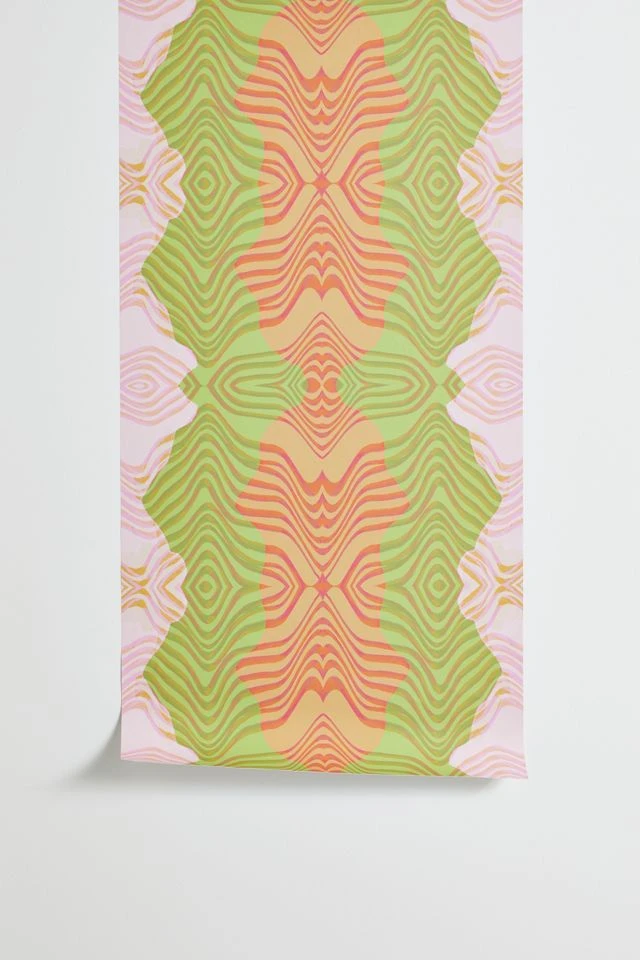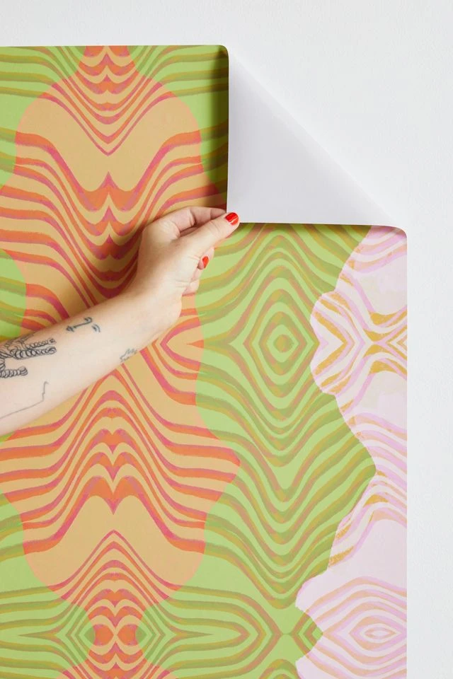 Easily removable stick-on wallpaper from Sewzinski featuring distorted forms in vivid hues. Cut in panels you can use to accent one wall or tile all over your room. Comes with one strip of wallpaper in an allover repeating pattern – choose from three different sizes to best suit your space.