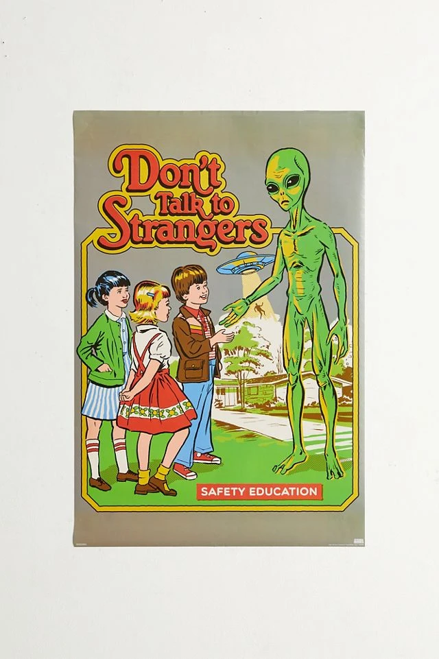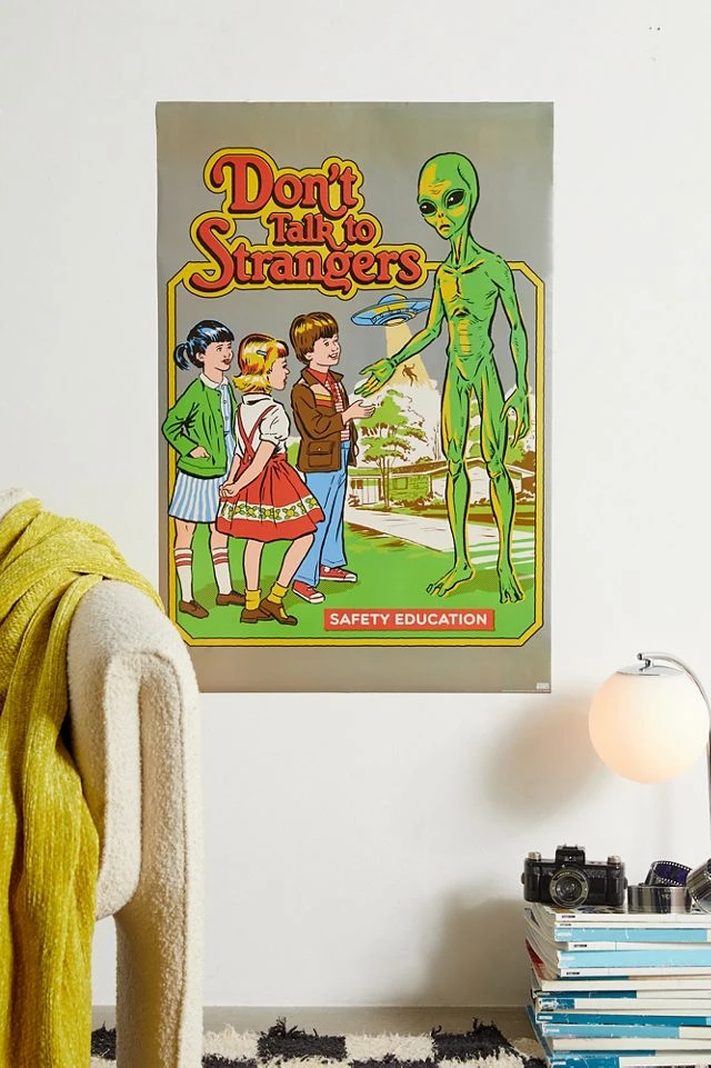 Add a humorous reminder to never talk to strangers to your space with this retro-inspired alien poster designed by artist Steven Rhodes.