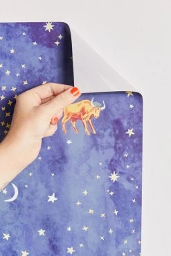 Easily removable stick-on wallpaper in a celestial design that brings the cosmos into your space. Cut in panels you can use to accent one wall or tile all over your room. Comes with one strip of wallpaper in an allover repeating pattern.