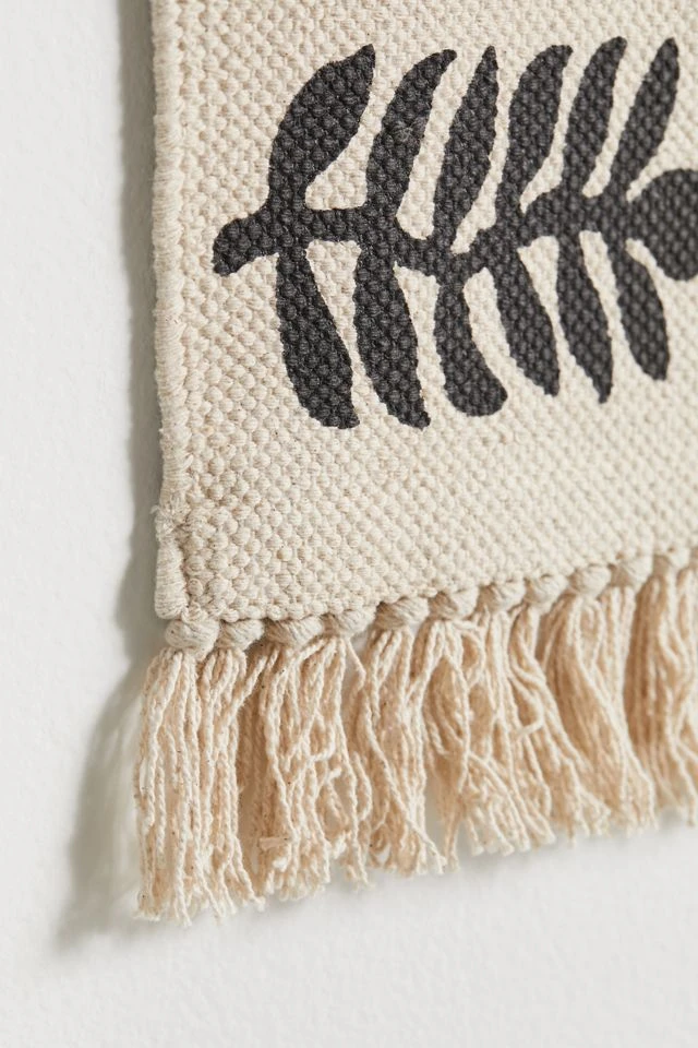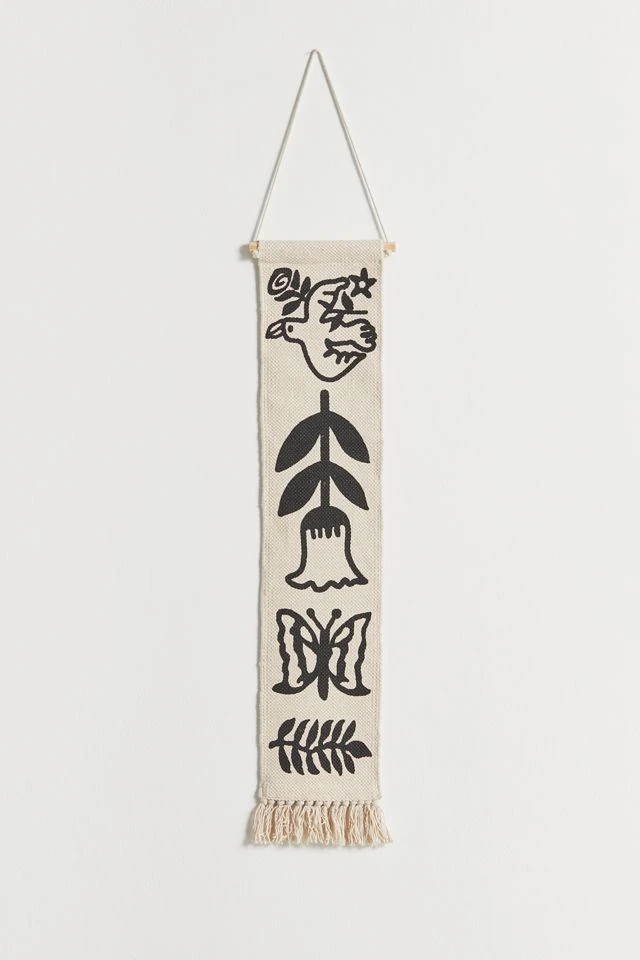 Add a sweetly femme touch to your décor with this woven wall hanging featuring whimsical-inspired icons printed on top of cream-toned cotton. Trimmed with fringe tassels. Available exclusively at Urban Outfitters.