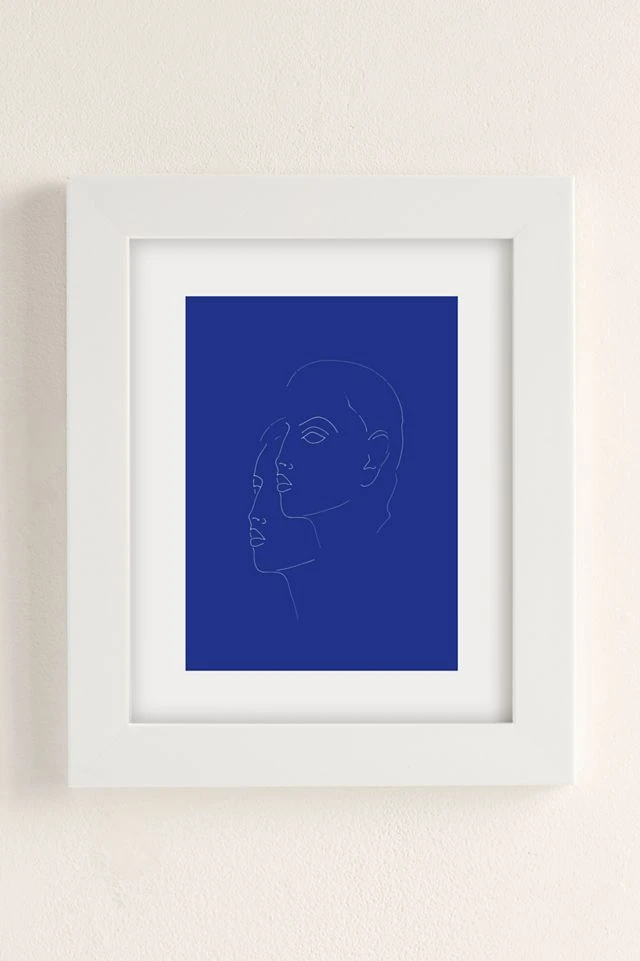 Delicate linework forms two profiles across this rich blue art print from work by vera. Printed on archival paper made from cotton pressed in Italian mills, this high-quality art print is available in sizes and frames just right for your space. First select your frame (or go frameless), then select your size.