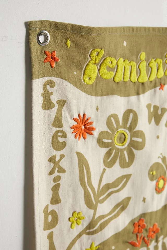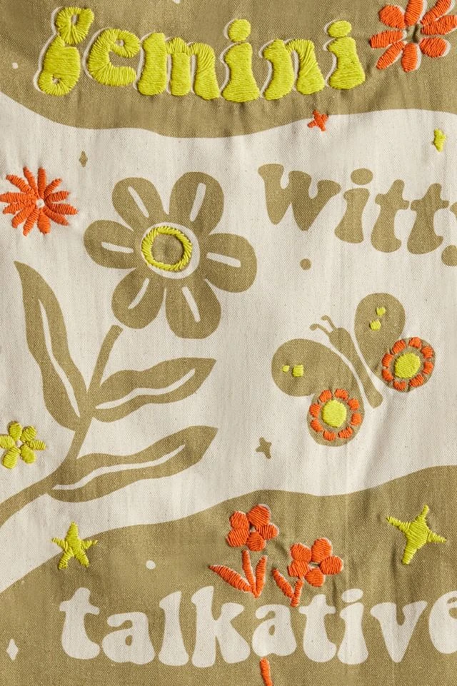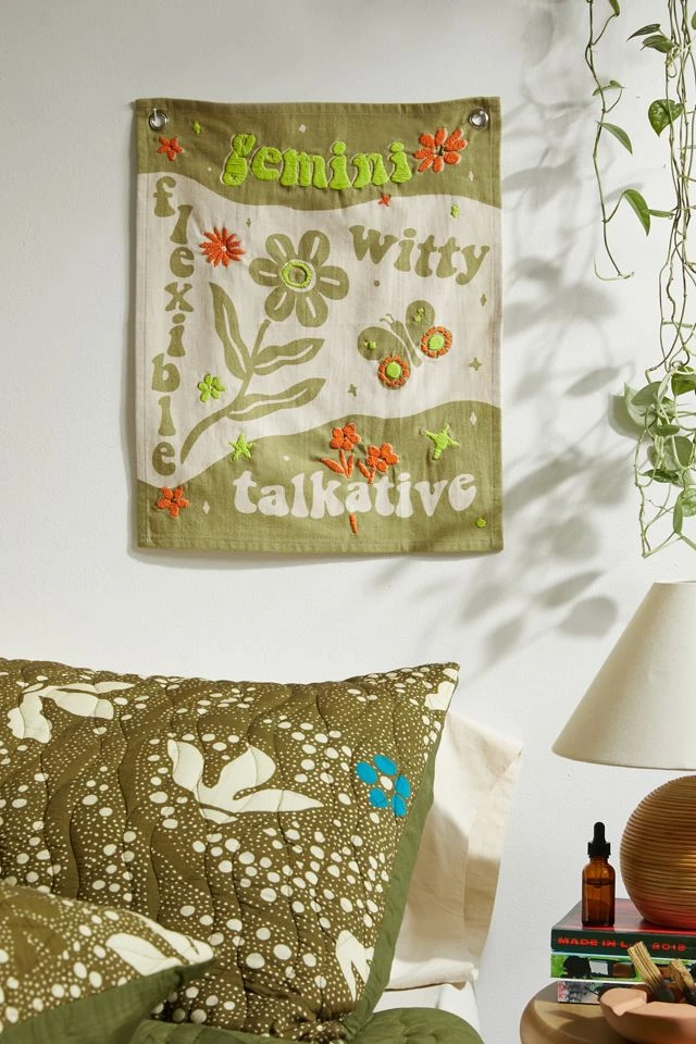 Celebrate your star sign with this little tapestry featuring embroidered botanical motifs surrounded by characteristics of your sign. Topped with metal grommets for easy hanging. Available exclusively at Urban Outfitters.